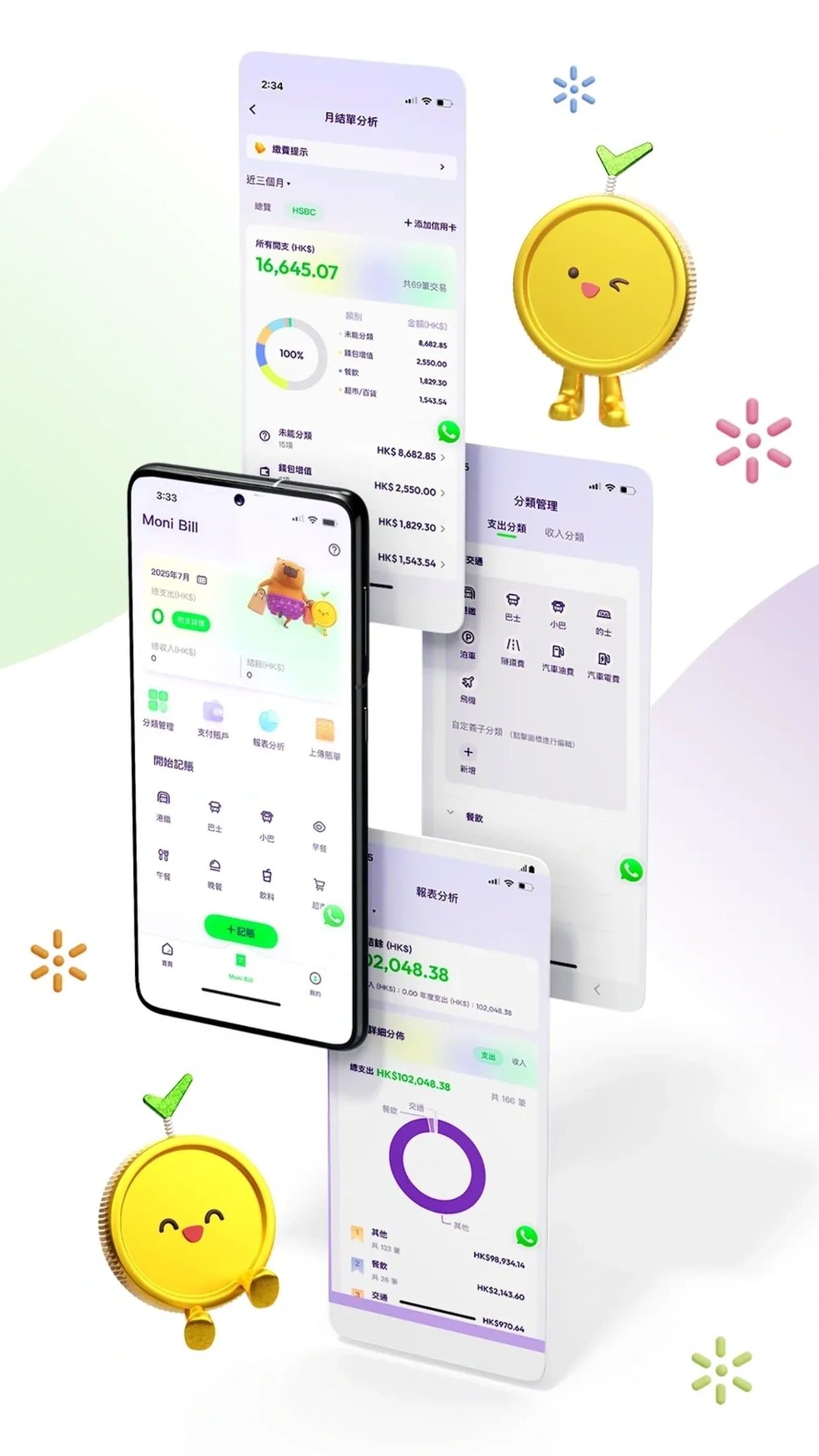 Moni Bill提供的記賬、分類、總結、整合分析、提醒及提示服務都不會收取任何費用。
